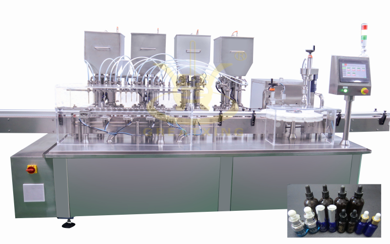 16 head straight line and screw cap machine is a kind of high efficient liquid filling medicine and all kinds of cosmetic, food and other liquid filling of automated packaging equipment. It is mainly composed of automatic transmission parts, automatic feeding section, servo filling and center wheel transmission part, vibration plate cover parts, mechanical hand cover parts, automatic screw cap parts, electrical components, function by PLC programmable controller for the automatic control. Production location link all have detection, which can realize the bottle does not reach the designated position is not turning, no bottle no filling, no bottle no stamp, and other functions. Filling machine has reasonable design, simple operation, high precision, high degree of automation, high production efficiency, stable performance of long period running, maintenance is convenient wait for a characteristic, the equipment technology can reach the advanced level of the domestic packaging industry. Equipment is mainly made of high-quality stainless steel SUS304 material contact parts are made of high-quality stainless steel SUS316L comply with national GMP production standards of pharmaceutical packaging equipment.